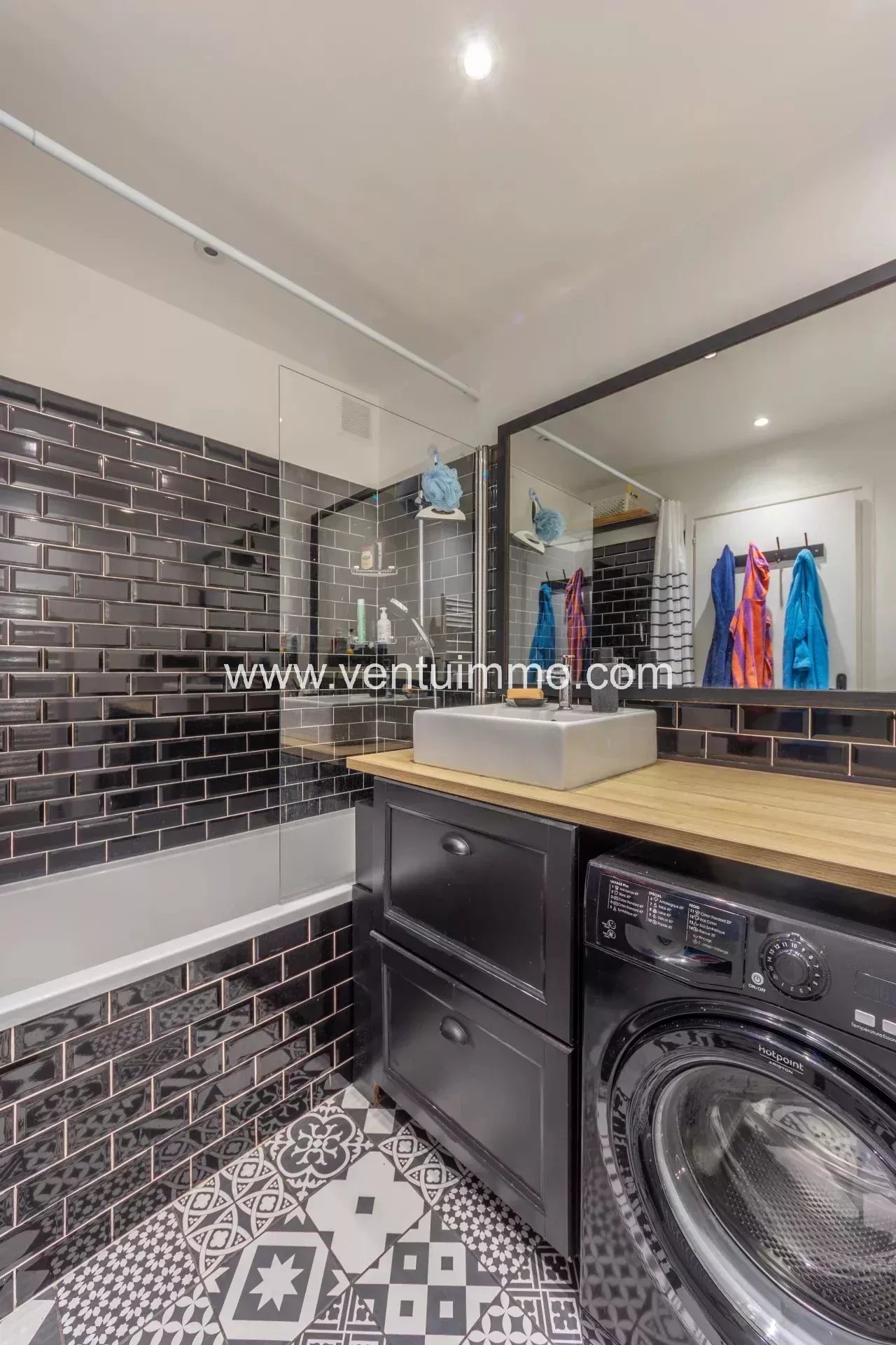 It comprises an entrance hall, a living room, a contemporary semi-independent kitchen, both of which open onto a 14m² terrace, two bedrooms with fitted closets, a shower room, an independent toilet and plenty of storage space.