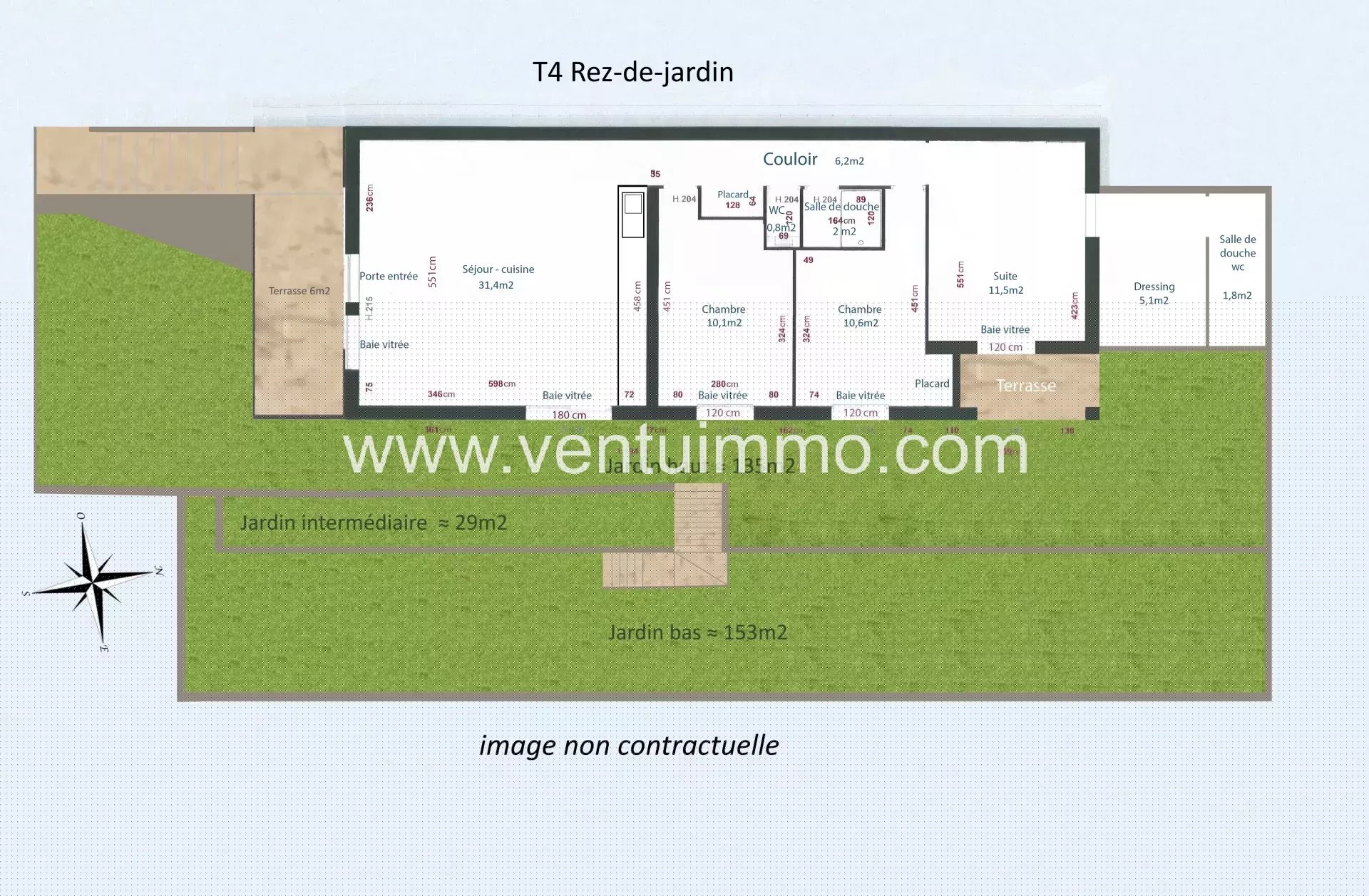 Il giardino di 280 m² esposto a est e sud è accessibile da tutte le stanze.